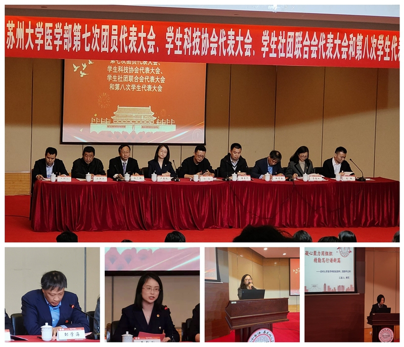 3月28日下午2点,医学部在炳麟图书馆一楼学术报告厅举办了第七次团员代表大会、学生科技协会代表大会、学生社团联合会代表大会和第八次学生代表大会。校党委宣传部副部长孙磊老师、校学生工作处副处长潘爱华老师、校团委副书记严韵致老师、医学部党工委书记邹学海老师、医学部常务副主任徐广银老师、医学部党工委副书记黎春虹老师、医学部学工办主任温洪波老师、苏州大学附属第二医院团委书记李柳炳老师、苏州大学附属儿童医院团委书记凌靓老师应邀出席了会议。严韵致老师和邹学海老师分别代表校级职能部门和学部党工委在大会进行了致辞,会议审议通过团委、学生会、科协、社联2019-2020年工作报告;选举产生新一届共青团苏州大学医学部委员、学部学生会委员、学部学生科技协会理事、学部学生社团联合会委员。
