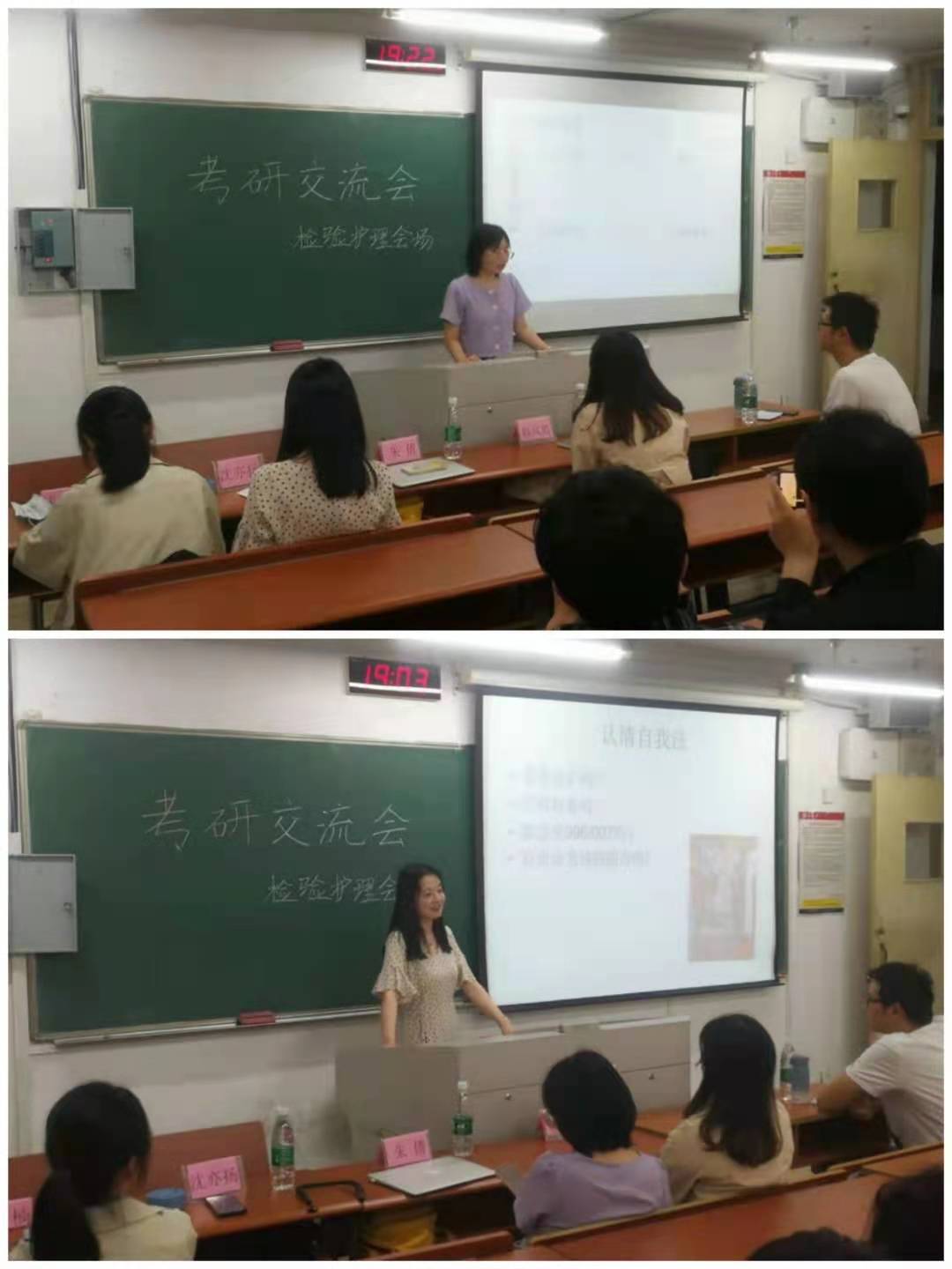 在医检护理会场中,考研到苏大护理学学硕的赖凤霞同学介绍了考研的范围、复习策略及书目。考研到兰州大学护理学的朱倩学姐通过自身经历,分享了自己的考研计划、目标院校选择方法等,并讲述了本人考研原因与选择以及研究生的生活,为同学们提供了宝贵的参考意见。考研苏州大学附属第二医院临床检验诊断学学硕的钱费楠同学以备考的过程为线索,分享了择校和备考方面的经验,并提供了“主动背、多温故、动手写、有规划”的建议。中国医科大学附属盛京医院临床检验诊断学沈亦扬同学,她用诙谐轻松的方式,向大家介绍了考研的“心理调节大法”以及备考期间的时间安排。