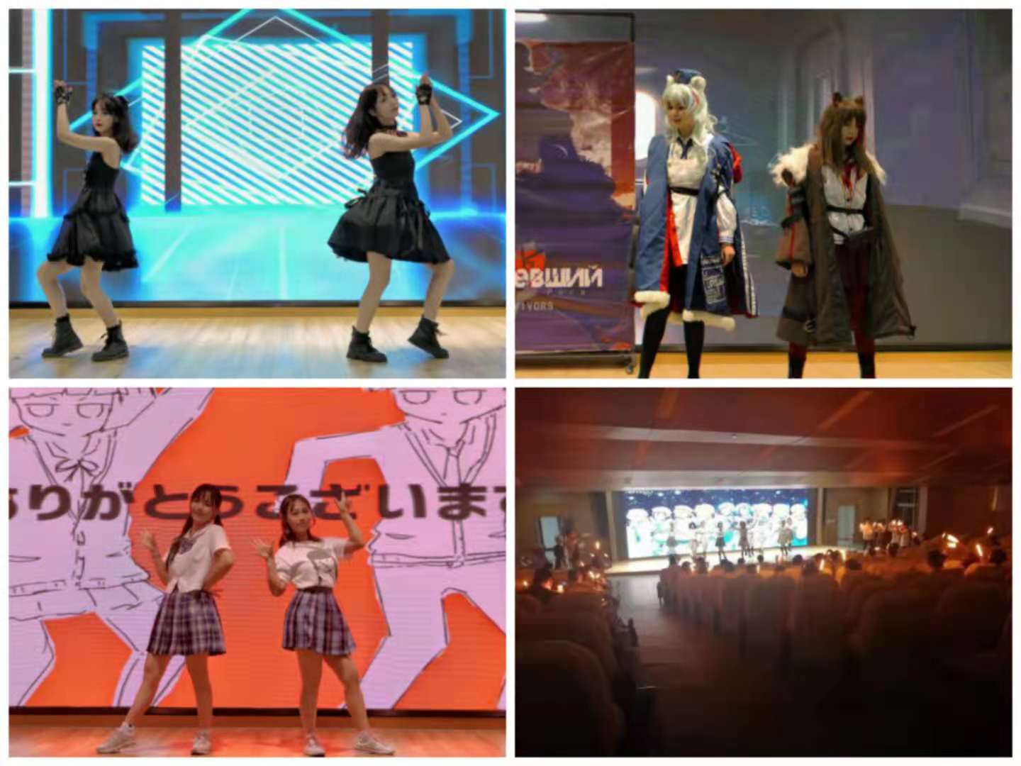 晚会由舞蹈,演唱,舞台剧,走秀等十个节目组成。开场舞蹈《随心所欲mercy》拉开了晚会的序幕,接下来的的走秀《两片面包》由our动漫事务所各部门联合完成,表演者们身着华美的服饰悉数登场,既带动了全场氛围,也将社团特色完全展现。翻唱歌曲《飞奔向你》《打上花火》均来自年轻人们耳熟能详的动画电影,歌手们毫不怯场,高超的演唱技术仿佛将大家带入色彩斑斓的动画世界。绯舞之樱动漫社的两位同学带来的舞蹈节目《太阳系disco》活力四射,给现场添加了激情与动感。小游戏与抽奖环节的短暂休息之后,主持人带着大家学习了简单的应援棒使用方法,在接下来的舞蹈《snow halation》中一齐点亮,将活动气氛推向了高潮。最后由主持人公布抽奖结果,分发奖品,活动也在欢声笑语中落下了帷幕。