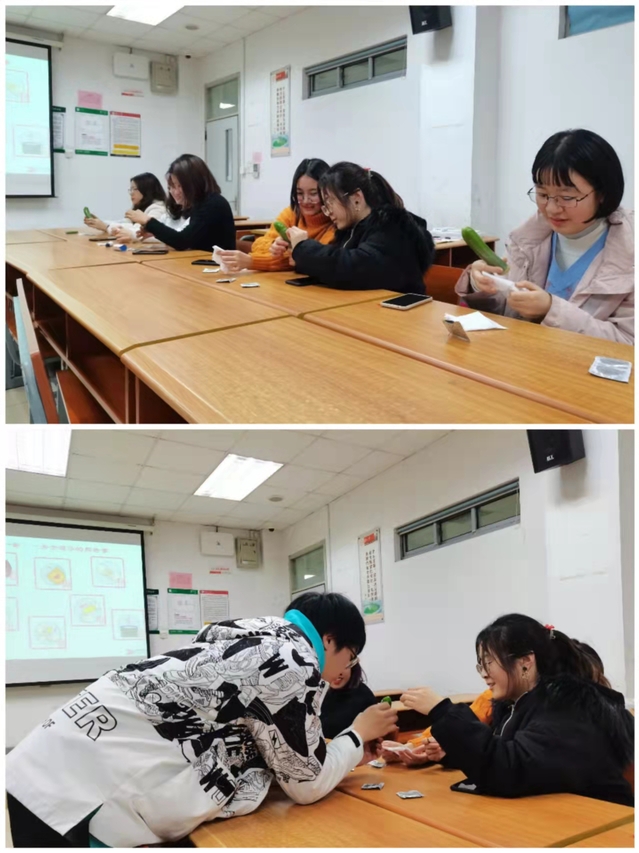 然后就进入了实物操练的阶段。负责人给每位同学分发了避孕套和黄瓜香蕉,由小董老师教导该如何正确使用避孕套。简单概括下来就是七个字:看、撕、挤、扭、套、取和丢。从一开始的观察是否过期到如何打开、如何判断正反,小董老师都不厌其烦地耐心教导,同学们也都自己上手操作了一番,纷纷表示学到了非常实用的知识。