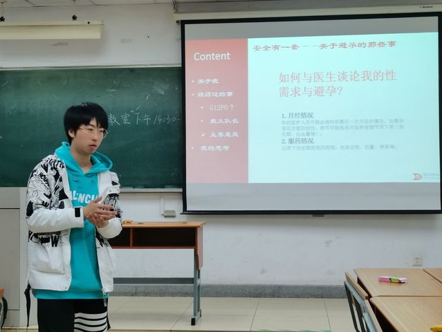 之后小董老师又给同学们分享了他的一位朋友险些造成女朋友意外怀孕的事件。通过这个事件,他严肃地向同学们介绍了人流手术的流程和可能会导致的危害,同时强调了“责任感”的重要性。同时他也联想到该如何和医生讨论自己的性需求和避孕这个话题,并与同学们分享了他的观点。
