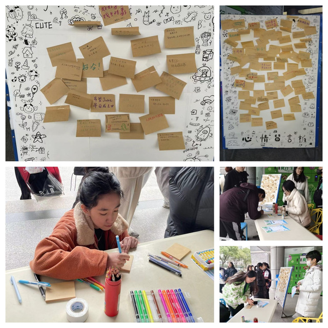为扩大本次活动的影响力,提高同学们的参与度,医学院青协与苏医心协的志愿者们在一期、二期食堂楼下宣传,耐心地为同学讲解本次活动的意义与细节。志愿者们鼓励同学们勇敢写下自己的心情、对未来的期许,并张贴在特制的心情留言板上;或是用不同的彩笔写上自己对某位同学的鼓励或是解答。“成功上岸”“学业顺利”“展望美好生活”“祝愿家人朋友快乐健康”……用笔墨书写出同学们对未来的美好展望;“如何学习编程”,一个个当下的困惑在留言板上得到解答;“寻找相同爱好的同学”,同学们通过这个途径找寻志同道合朋友。