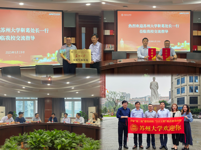 为落实我校2023年招生宣传工作要求,搭建高校与高中协同育人桥梁,进一步扩大苏州大学在重庆市的知名度和影响力,5月18日至19日,苏州大学招生就业处处长靳葛、重庆招生组副组长、苏州医学院党工委副书记、副院长孟玲玲、苏州医学院药学院党委书记王欣、苏州医学院团委书记王昌伟、辅导员洪瑜武一行赴重庆市开展本科生招生宣传工作。