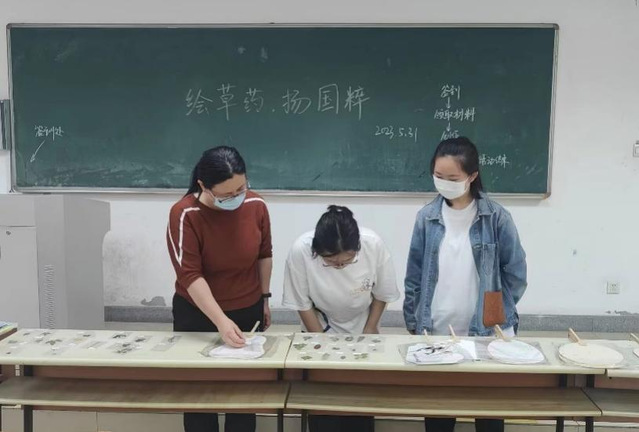 传统医学协会为同学们提供了13种不同类型的团扇、6盒画笔、50份中草药标本,引导同学们用手中的画笔画下草药的形态、记住它们的用途或者写写与草药相关的小故事。社团指导老师医学院学工办副主任孙静老师也来到活动现场,观摩、指导本活动并与同学们一起体验在团扇上绘画中草药。
