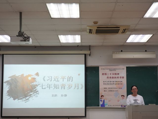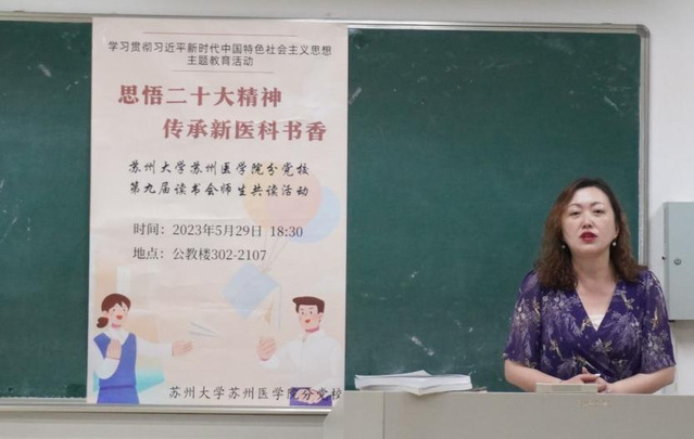 为深入学习贯彻党的二十大精神,倡导中华民族“好读书,读好书”读书风尚,营造“书香校园”良好文化氛围,提高党校学员阅读能力,加强党校学员对党组织的认识,2023年5月29日苏州大学苏州医学院分党校于独墅湖校区一期302-2107教室举办“思悟党的二十大精神,传承新医科书香”第九届读书会师生共读活动。出席本次活动的老师有:医学院学工办副主任、分党校秘书长孙静老师,医学院学工办副主任、读书会特聘教师陆艳老师,医学院团委副书记、读书会特聘教师李法君老师,医学院2019级辅导员、读书会特聘教师姜颖鹏老师。苏州大学苏州医学院分党校第九届读书会全体成员参加了本次活动。