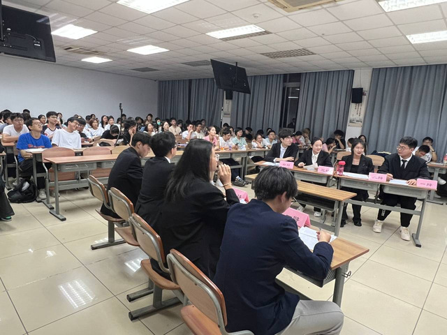然后,是观众提问环节。23级各班的同学对本次表演赛的内容颇有兴趣,在认真观看了比赛后,与辩手产生了激烈的思维碰撞。他们积极发言,提出自己独到的见解,与双方选手展开了热烈讨论。
