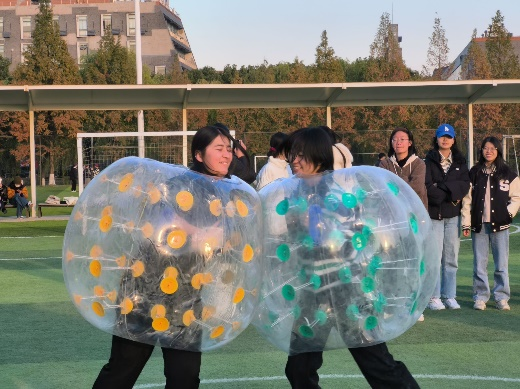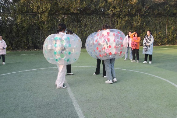 正式活动中,同学们积极参加“借物跑”“碰碰球赛”“心心相印”三个项目。其中,“借物跑”要求同学们在慢跑过程中抽任务并完成,“碰碰球赛”要求参与者两两一组套上碰碰球进行身体对抗,“心心相印”要求选手两人一组,夹住气球进行20米折返接力跑。