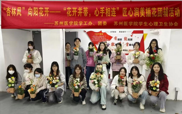 为深入落实五育并举促进心理健康工作,扎实推进“润心”行动,充分放松苏医学子的身心,展现同学们的青春活力,在丰富课余文化生活的同时进一步提升医学人文素养。在医学院党政领导的关心和学工团队积极宣传、精心组织下,由学工办、团委主办,学生心理卫生协会承办的“花开并蒂,心手相连”插花活动在2024年4月14日正式举办,带领同学们在花卉的芳香中,感受心灵的愉悦,感受独属于春天的一抹亮色。