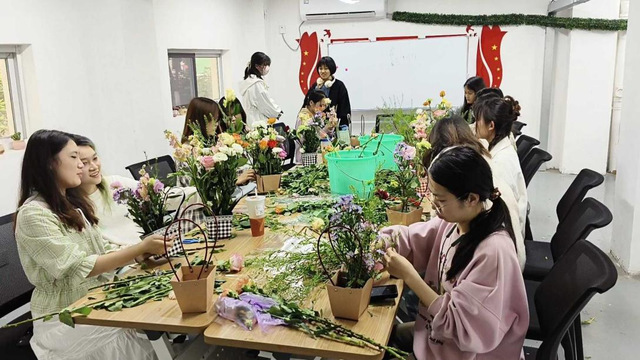 基于对花艺理论知识的学习和了解后,同学们打理着手上的花卉进行自由创作。艺术感满分的同学开始了自由发挥,制作与众不同的创意插花。浪漫杏黄的香槟玫瑰,高贵神秘的桔梗,风姿绰约的洛神花,还有各色花卉放满了一桌。大家在与同伴的讨论中,在自己的奇思中,讲究色彩的搭配,使每一个插花作品别致而美好。