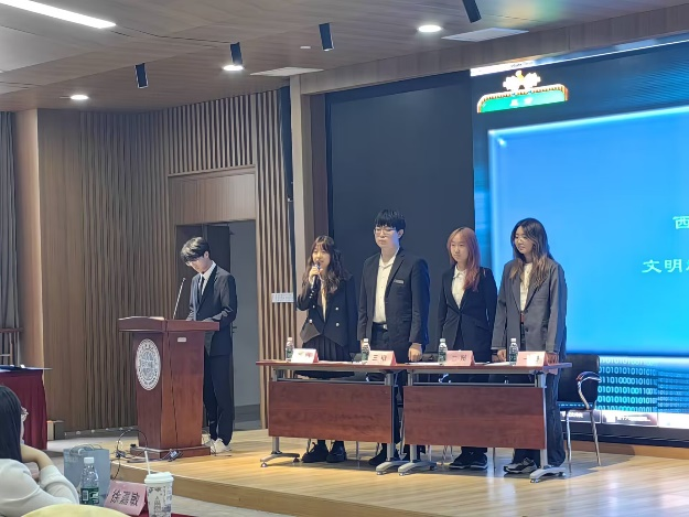 决赛正式开始,正反双方针对“文明越发展,人越不是/是自己的主人”这一辩题,为大家带来了一场精彩的比赛。在比赛过程中,反方四辩同学和正方四辩同学围绕文明发展下对人的生命影响这一问题展开了精彩对决,令人印象深刻。本场比赛的自由辩环节尤其激烈,优秀的发言不断被更优秀的发言所推翻,一个个难以挖掘的漏洞被双方辩手不断挖出,双方辩手针锋相对,唇枪舌剑,激烈的对决点燃了每一位参与人员的辩论之魂。而在最后的总结陈词中,双方就辩论内容进行了梳理与升华,为观众提供了更全面的思考。