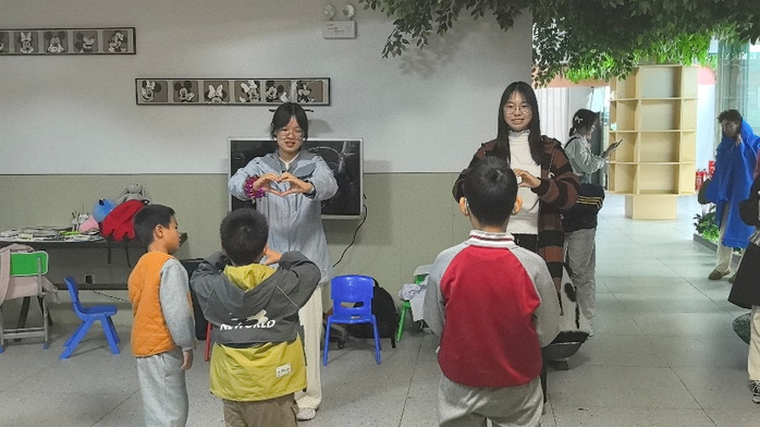 开场的热烈过后,活动进入了精彩纷呈的核心演出环节。一系列精心编排的节目轮番上演:《小美满》手势舞与合唱温馨动人,孩子们专注地模仿着每一个动作;生动有趣的话剧表演引得台下笑声连连;而活力四射的《大家一起喜羊羊》舞蹈更是将气氛推向新的高潮。志愿者们全情投入,孩子们喜笑颜开,在轻松愉快的氛围中,艺术的桥梁悄然架起,让“星星的孩子们”真切感受到了来自世界的温暖与陪伴。