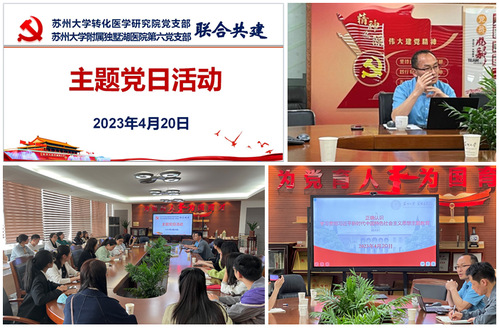 4月20日,联合共建的转化医学研究院党支部与附属独墅湖医院第六党支部在独墅湖校区炳麟图书馆819党员活动室举行主题党日活动。活动旨在加强基础与临床融合,通过互动赋能,以临床问题研究为导向开展深度合作,提升双方科研水平。本次党日活动由转化医学研究院党支部书记陈永井主持。