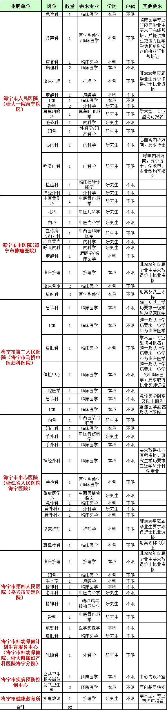 海宁市卫生健康系统公开招聘事业单位紧缺岗位和高层次卫生急需人才62名,招聘岗位详见招聘岗位条件及计划表(附件1)。
