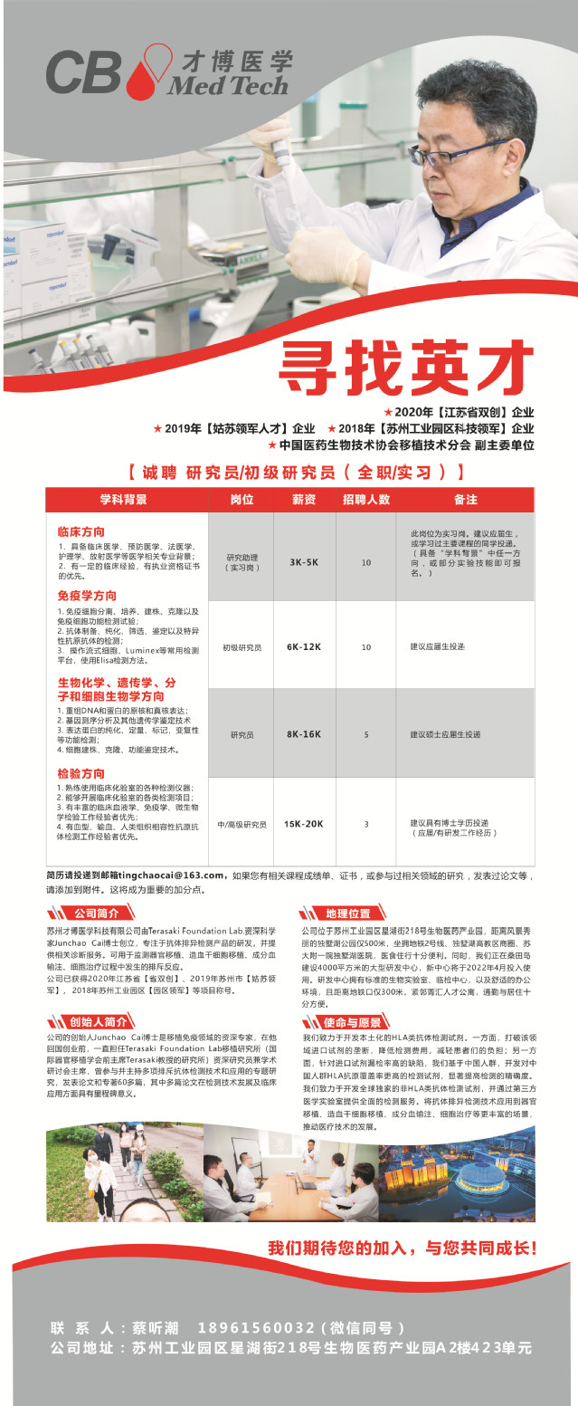 苏州才博医学科技有限公司由抗体排异领域知名专家JUNCHAO CAI博士创立,专注于开发移植排异免疫监测产品与技术服务,应用于器官移植、造血干细胞移植、成分血输注、细胞治疗过程中发生的排斥反应。公司已获得2020年【江苏省双创】、2019年【姑苏领军】, 2018年【苏州工业园区领军】项目称号。